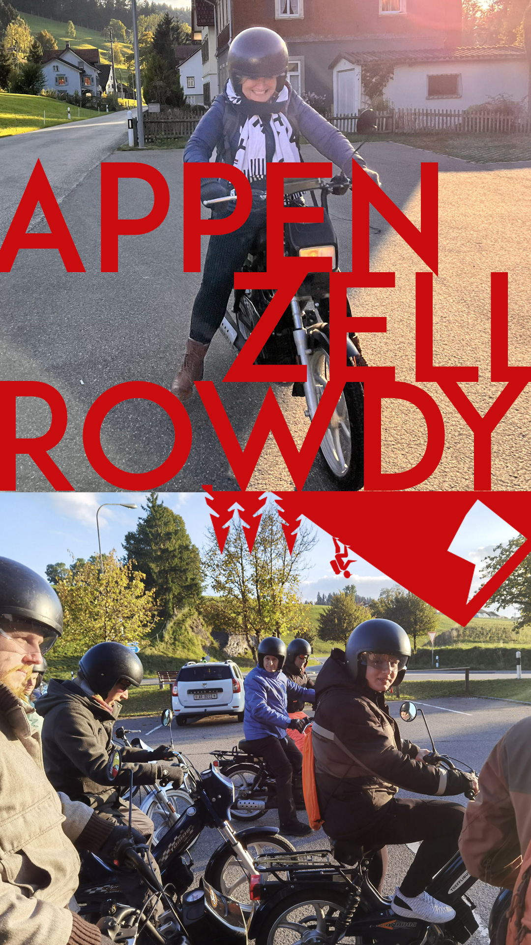 Mit Regenhosen, dicken Jacken, Kappen und Handschuhen bekleidet (eben voll die Töffli-Rocker), ging das Abenteuer "Töfflitour" gegen Feierabend los. Als sich jeder einen Helm und ein Töffli schnappen durfte, wurden Kindheitserinnerungen wach und das Kind im Manne/Frau geweckt. Nach einer kurzen Instruktion, für alteingesessene Töfflifahrer und Neulinge, gings mit lautem Hupen im Rehetobel los. Mit einem breiten Grinsen und den herrlichen Strahlen der Abendsonne im Gesicht fuhren wir durchs Appenzellerland. Autofahrer und Fussgänger staunten nicht schlecht, als eine Kolonne von 15 Töffli-Rockern (Hell yeah) vorbeifuhr.