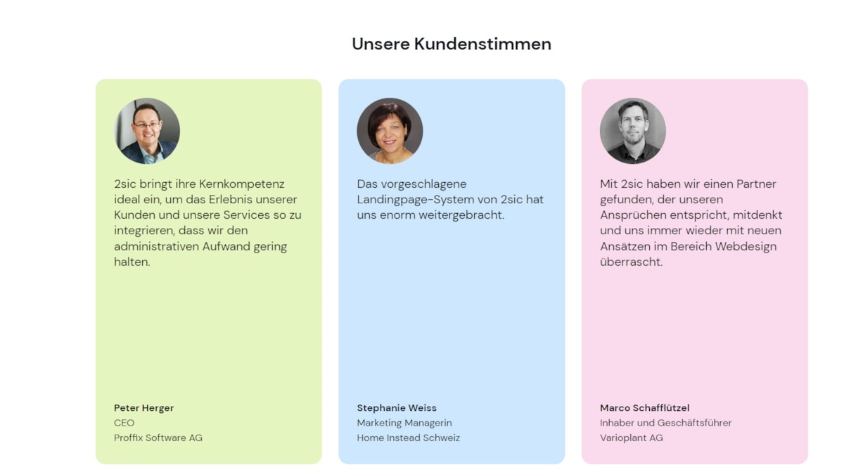 Diese Darstellung setzt auf eine klare Struktur, in der Kundenbewertungen in ansprechenden Boxen präsentiert werden. Jede Box enthält das Foto des Kunden sowie dessen Feedback, was die Authentizität unterstreicht. Die Hintergrundfarben sind an die CI/CD angepasst.