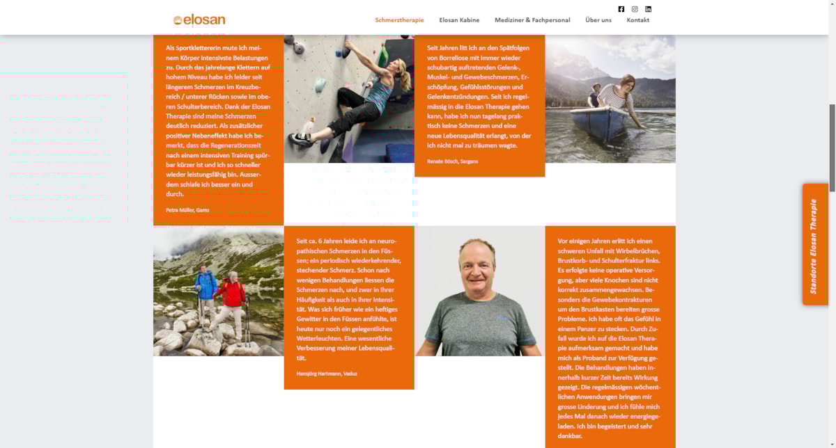 In diesem Beispiel sind die Testimonials übersichtlich und visuell ansprechend angeordnet. Die Verwendung der Elosan AG Farben in Kombination mit ansprechenden Bildern sorgen dafür, dass die Bewertungen ins Auge fallen und die Kundenbindung stärken.