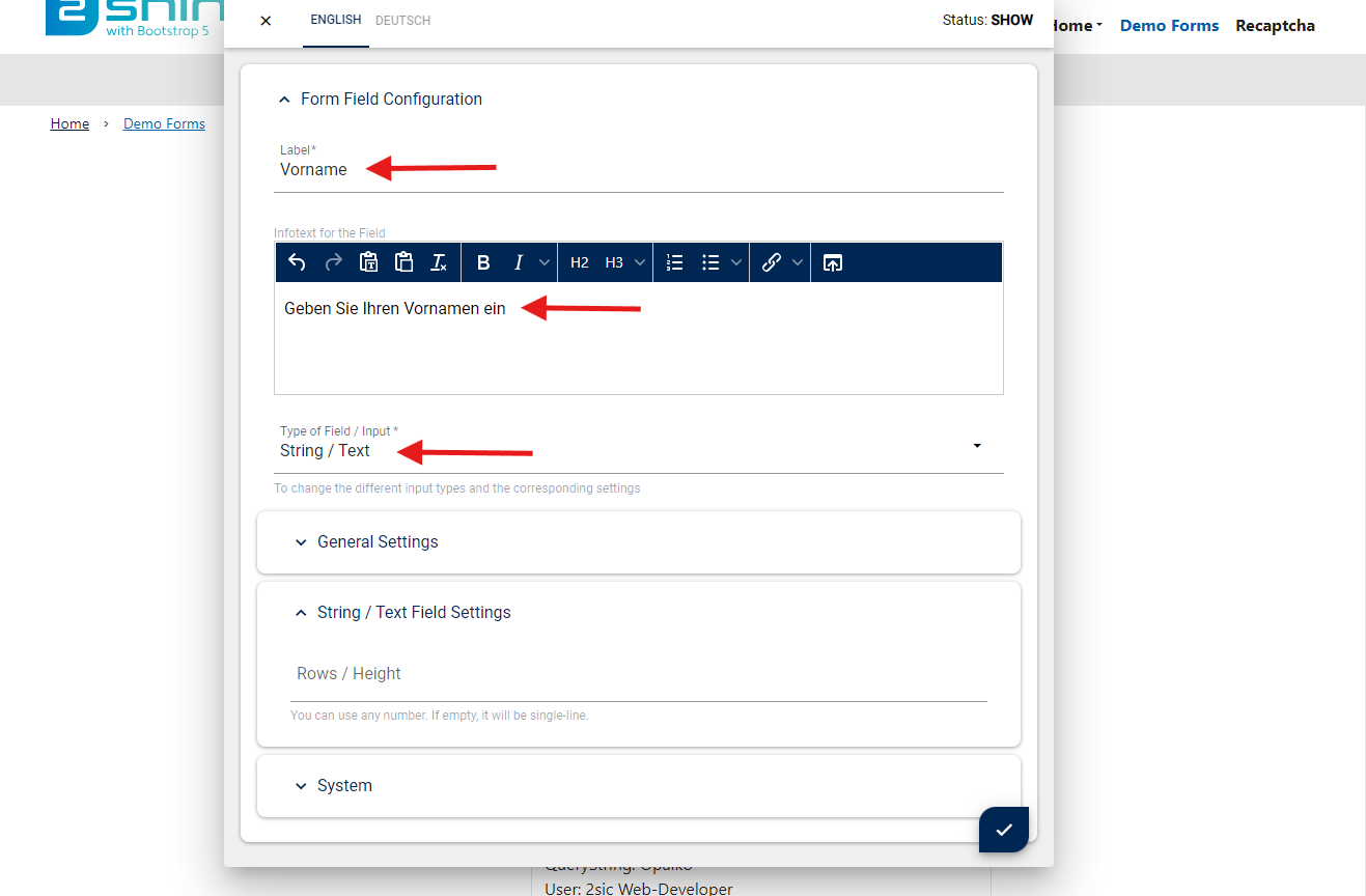 7. Es öffnet sich nun eine Eingabemaske in der du dein erstes Feld konfigurieren kannst. Benenne nun das Feld und definiere den Hinweistext für die User. Für ein Standardfeld wählst du die Feldkonfiguration "String / Text" aus. Zum speichern deiner Einstellungen klickst du auf den blauen Haken, rechts unten.