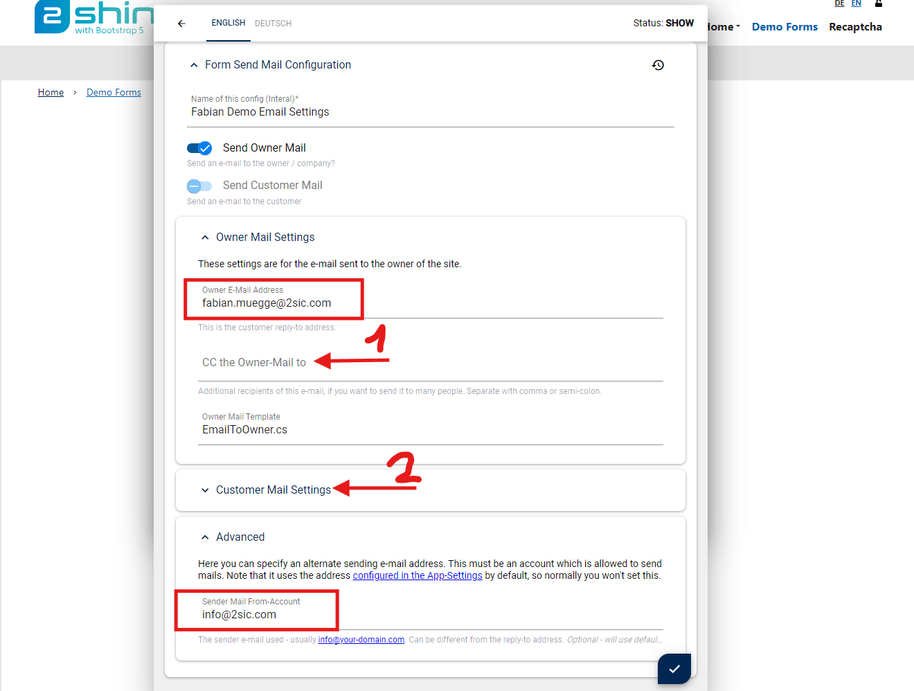 5. In den erweiterten Optionen kannst du nun bestimmen wer per E-Mail benachrichtigt werden soll, ob jemand ins CC soll oder von welcher Adresse der User eine Anmeldebestätigung erhält. In den Customer Mail Settings bestimmst du die Art der Anmeldebestätigung. Im Beispiel erhalte ich eine Mitteilung wenn sich jemand anmeldet. Die Bestätigung für den User wird aber von der Adresse "info@2sic.com" versendet.