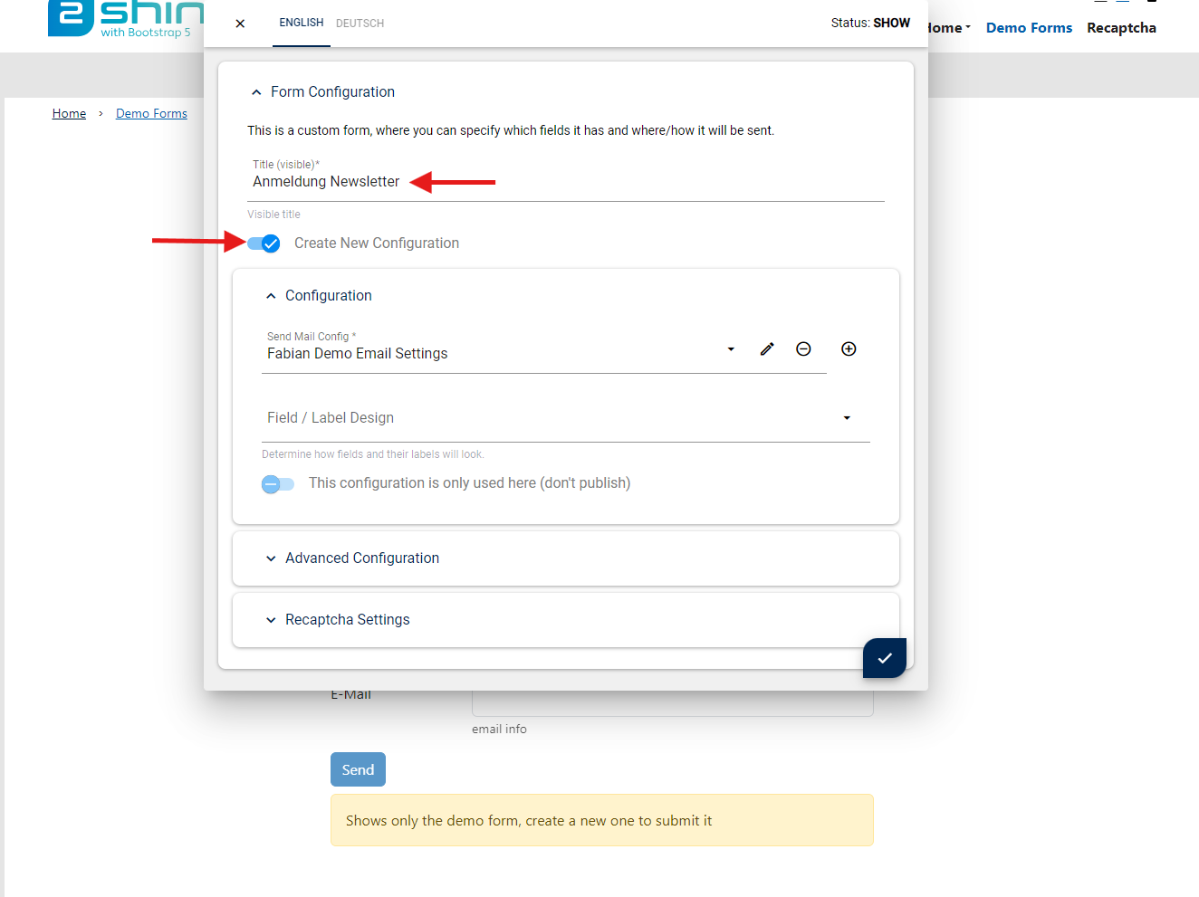 4. Gib deinem Formular nun einen klaren Titel. Im Beispiel: "Newsletter Anmeldung" und aktiviere den Schieber um eine neue Konfiguration erstellen zu können.