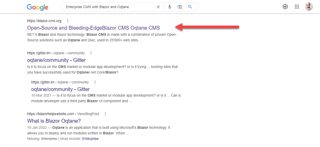 SEO ist für Oqtane ein noch sehr neues Thema. Mit blazor-cms.org haben wir es innerhalb von 24 Stunden geschafft im Google Index zu ranken und werden nun weiter experimentieren und die Integration optimieren.
