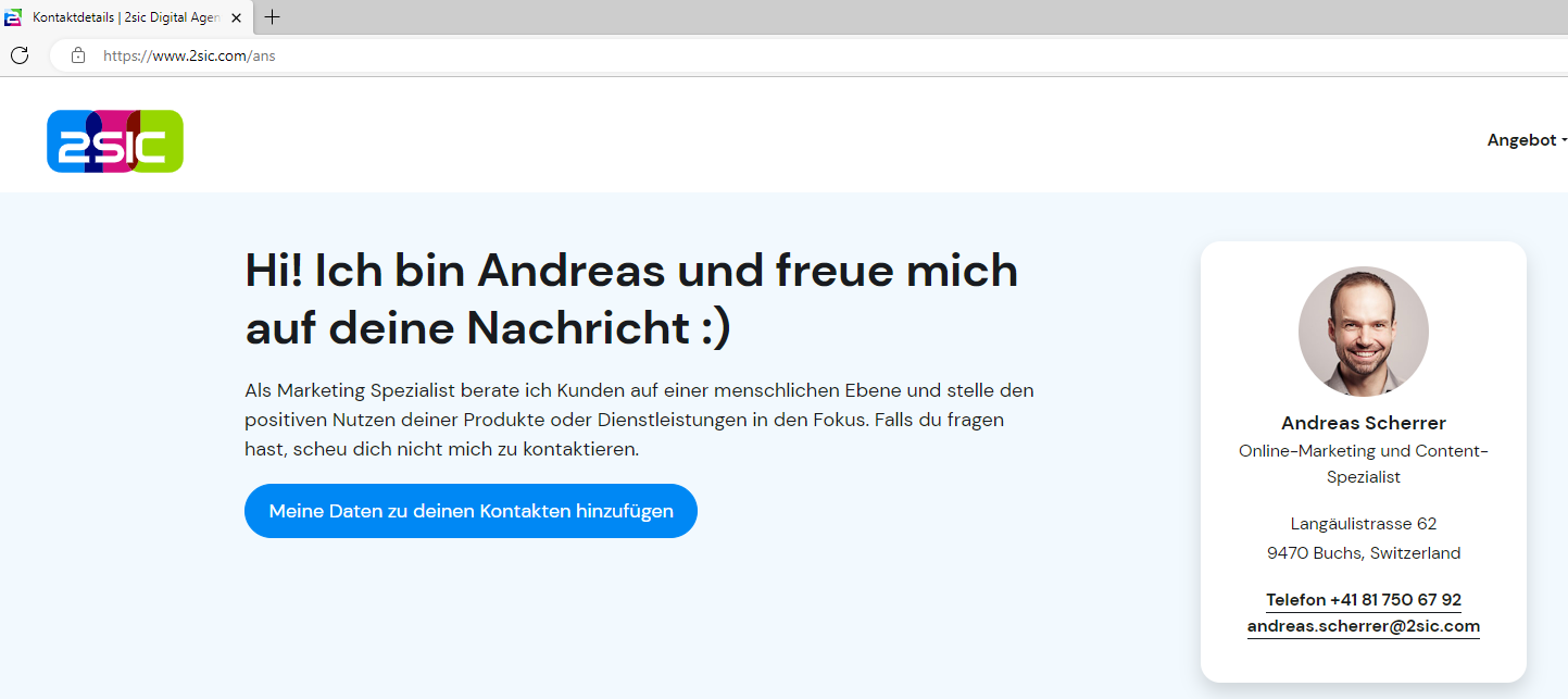 Eine kurze URL ist die Abhilfe, damit du dir das Buchstabieren einer komplizierten und langen E-Mail-Adresse ersparst. Als Beispiel sind meine Kontaktdaten über «2sic.com/ans» abzurufen. Bei einem Telefonat benötige ich nur die Webadresse, in diesem Beispiel also «2sic.com» und danach ein Schrägstrich (Slash) und mein Kürzel (ans). So sind sprachliche Probleme keine Herausforderung mehr und ich bin mir sicher, dass mein Gegenüber die korrekten Daten erhalten hat.