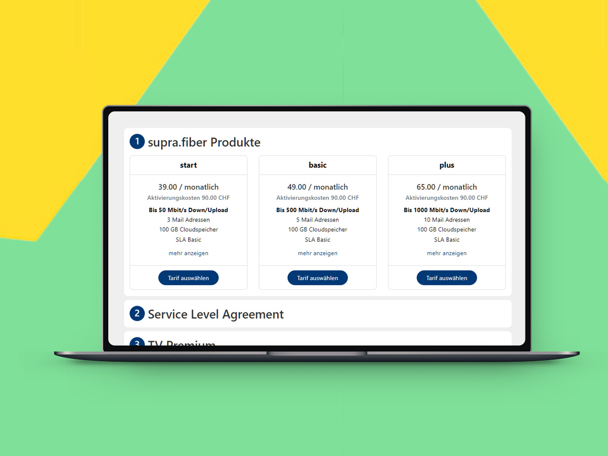 In Zusammenarbeit mit dem Supranet Team haben wir für die Nutzerzentrierung die Menü-Führung rundum erneuert und sowie den Offert- und Bestellprozess in Form eines Baukastensystems optimiert. Damit wird nicht nur die User Experience (Benutzererfahrung) verbessert, sondern auch die Erstellung von Angeboten und Kostenaufschlüsselungen zeitsparender, transparenter und einfacher in der Pflege.