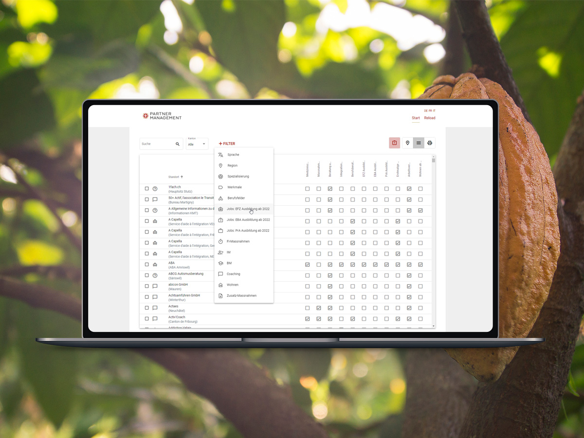 Für die Eingliederungsfachpersonen, die versicherte Personen der IV begleiten, hat 2sic eine Partnersuche programmiert. Dazu wurde eine Website für das IVSK-Partner Management aufgesetzt. Die Daten basieren auf der SharePoint Partnerliste, die zentral durch die Kontraktmanager gepflegt wird. Diverse Filter- und Sortiermöglichkeiten unterstützen die Suche nach einem passenden Ausbildungsplatz für die versicherten Personen. Eingliederungsfachpersonen haben im System die Möglichkeit, die Leistungserbringer und deren Leistung zu bewerten. So wird die Überprüfung der Qualität der Leistungserbringer ebenfalls sichergestellt.