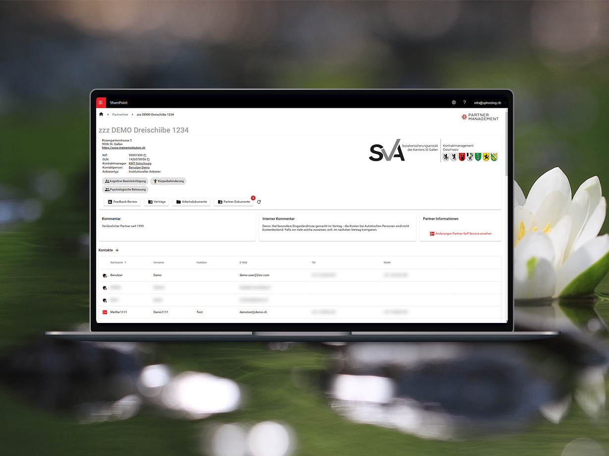 Über 40 Kontraktmanager in den einzelnen IV-Stellen arbeiten tagtäglich mit dem neuen Tool. Sie vereinbaren die Verträge und Rahmenbedingungen mit den Leistungserbringern. Bei diesen handelt es sich um Leistungserbringer aus verschiedensten Branchen, die Ausbildungsplätze und/oder Unterstützung für Personen mit gesundheitlicher Einschränkung zur Verfügung stellen. Die SharePoint-Lösung von 2sic ermöglicht den Kontraktmanagern das einfache Erfassen neuer Partner und die Pflege bestehender Partner. Zu jedem Partner sind zentral und übersichtlich alle Dokumente wie Verträge und Informationen zu Kontaktpersonen sowie Leistungen hinterlegt. Die Partnerübersicht in SharePoint ist jederzeit auch von unterwegs aufrufbar.