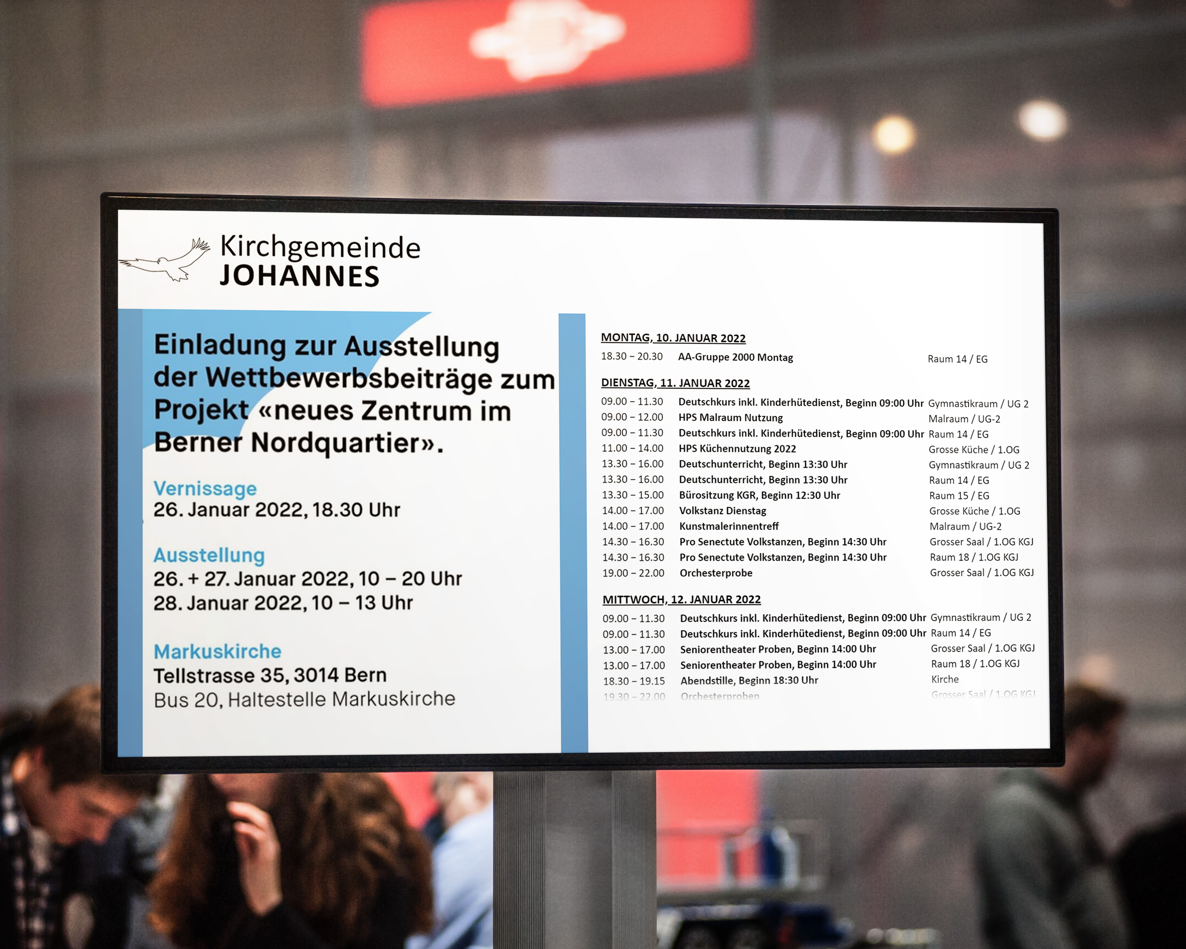 Um an 7 Standorten die Reservierungen abzubilden, wurde per Schnittstelle eine Infoscreen-Lösung umgesetzt. Diese zeigt aus 2reserve automatisch die Reservierungen auf einem Bildschirm an. Eine manuelle Erfassung der Reservierungen ist nicht mehr nötig. Zudem haben die Kirchgemeinden die Möglichkeit, Bildergalerien und Infotexte einzublenden, um Besucher über die Events zu informieren.