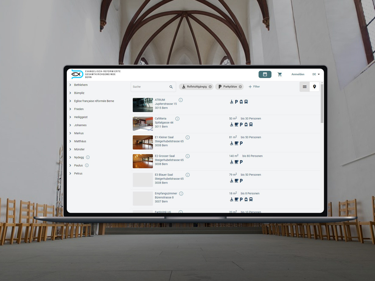 Aus einer vielschichtigen Verwaltung von 12 Kirchgemeinden entstand mit 2reserve eine individuelle Raumreservations-Lösung, die zentral und einfach verwaltet werden kann. Die Schnittstellen zur Buchhaltungssoftware sowie zu den Infoscreens bieten zusätzlichen Komfort im gesamten Buchungsprozess. Wir bedanken uns beim Kunden für das tolle Projekt und das Vertrauen!