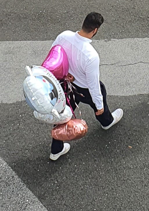 Und weil Liebe ja schliesslich sichtbar sein darf, muss Metin den ganzen Tag mit einem auffälligem Strauss Ballonen durch die Büros laufen – mit der stolzen Aufschrift: „Just married!“