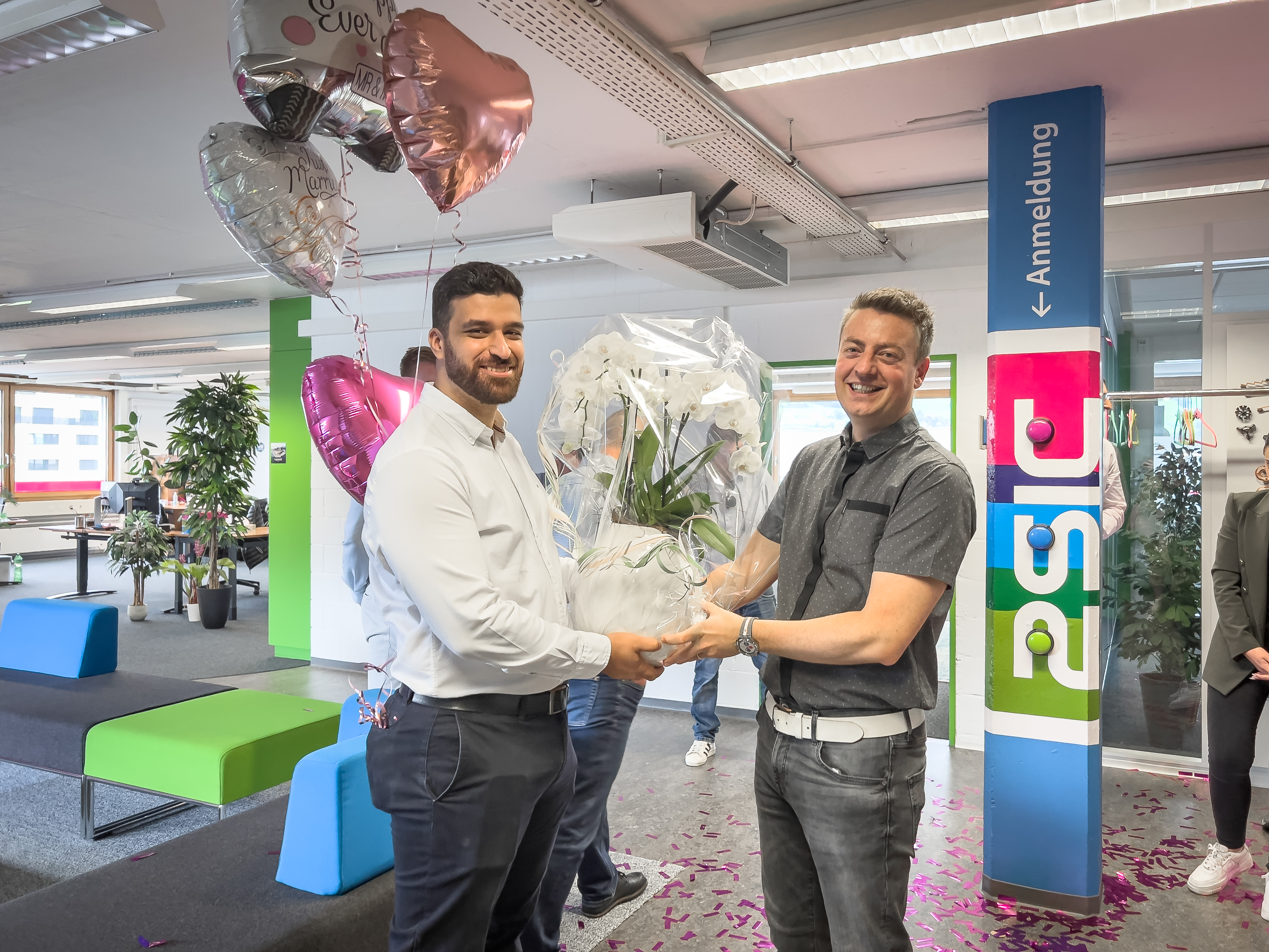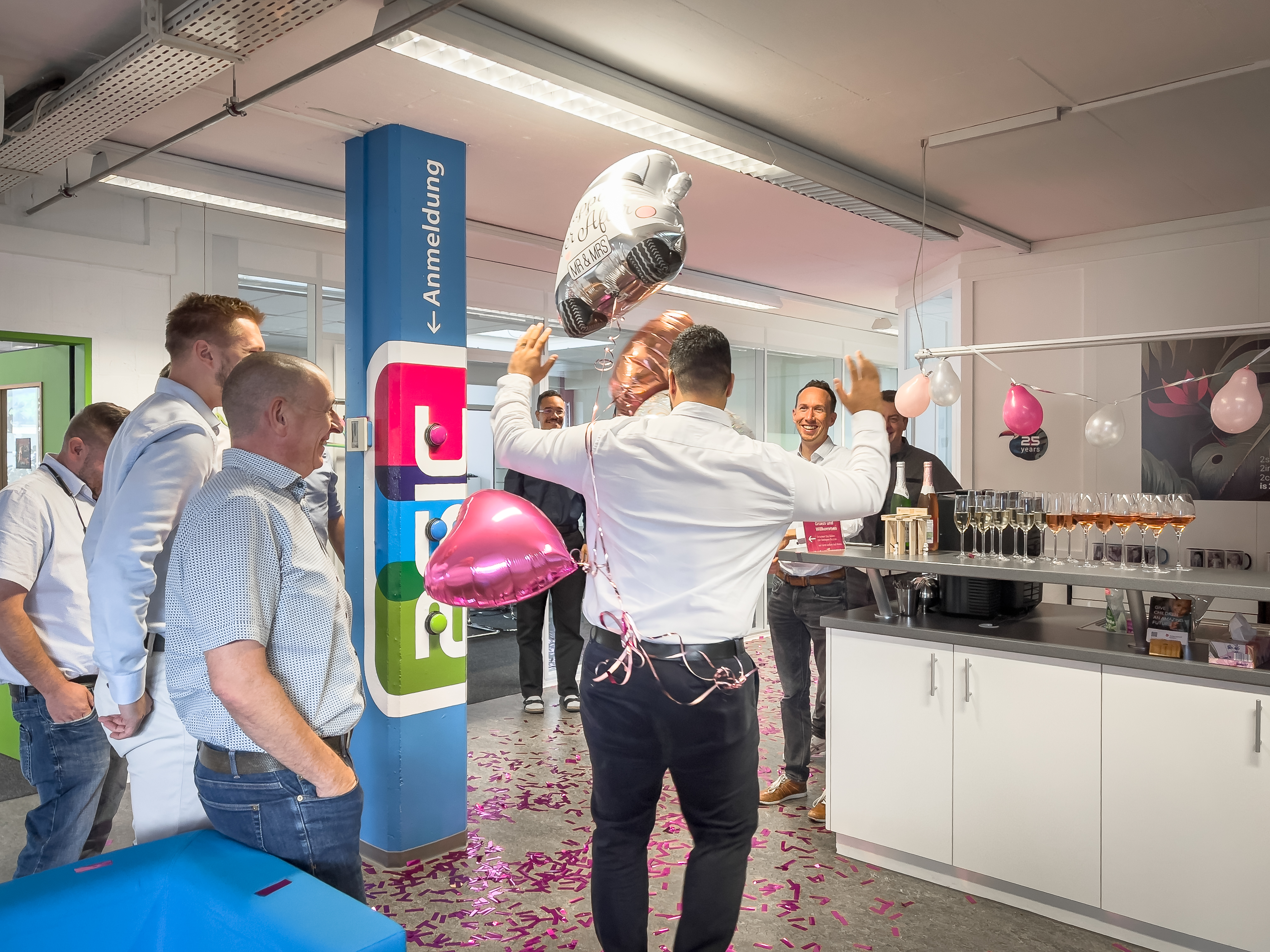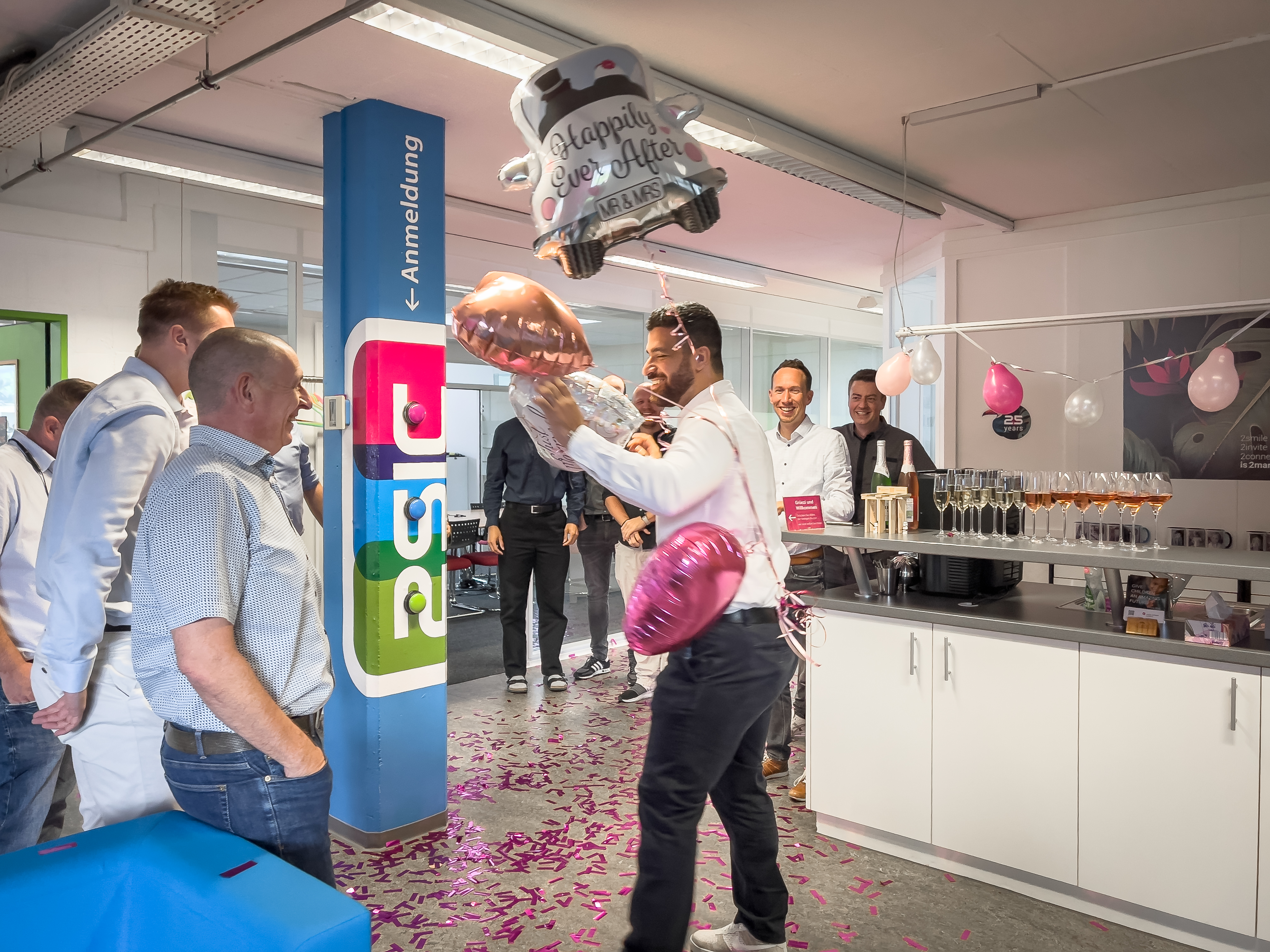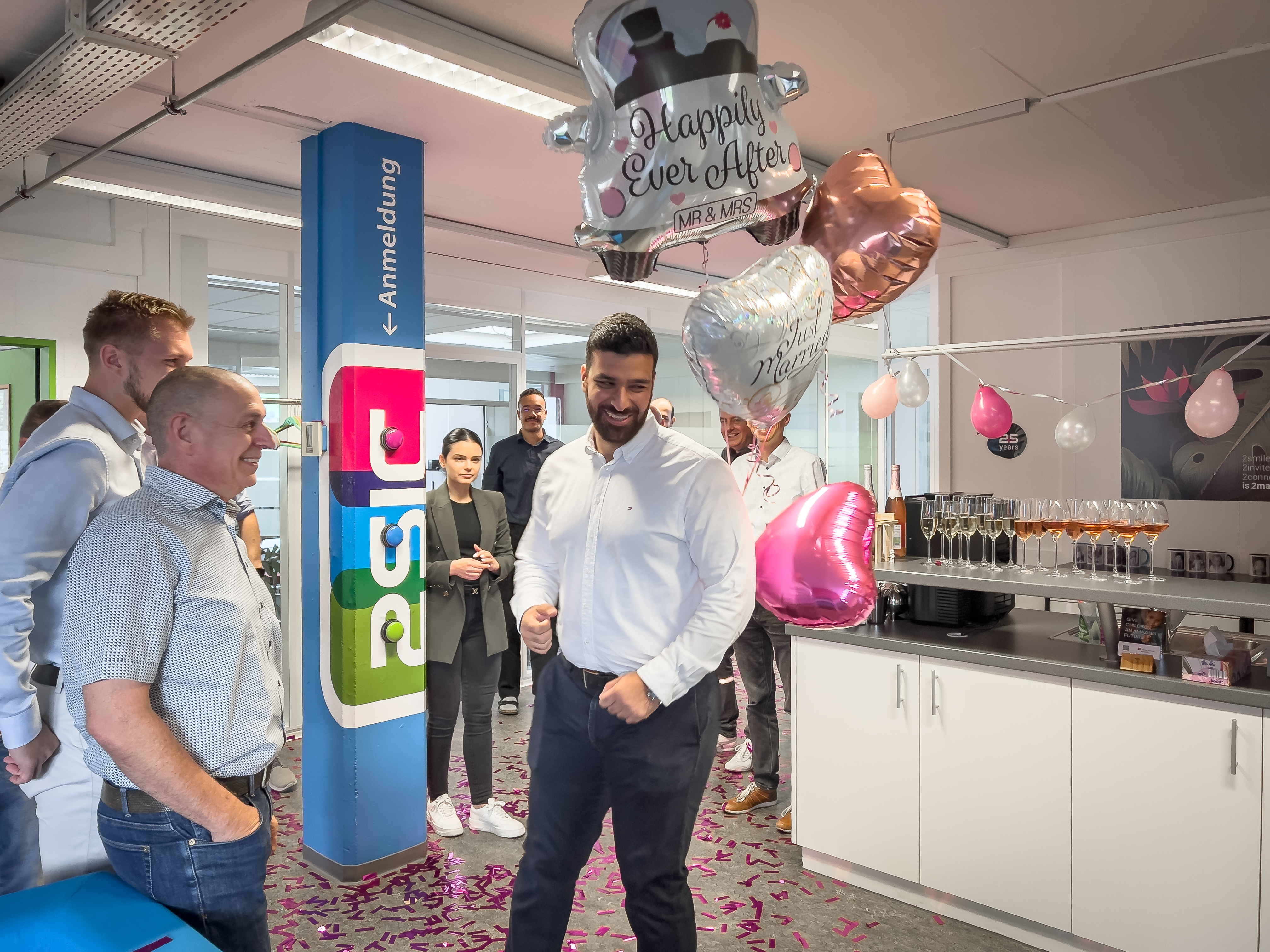 Am vergangenen Samstag hat IT-Spezialist Metin Gökcen seiner Verlobten das Ja-Wort gegeben – und heute durfte er gleich die nächste Überraschung erleben. Das 2sic-Team begrüsste ihn mit einem fröhlichen Spalier, weiss-pinken Ballonen und einer powervollen Konfettibombe.