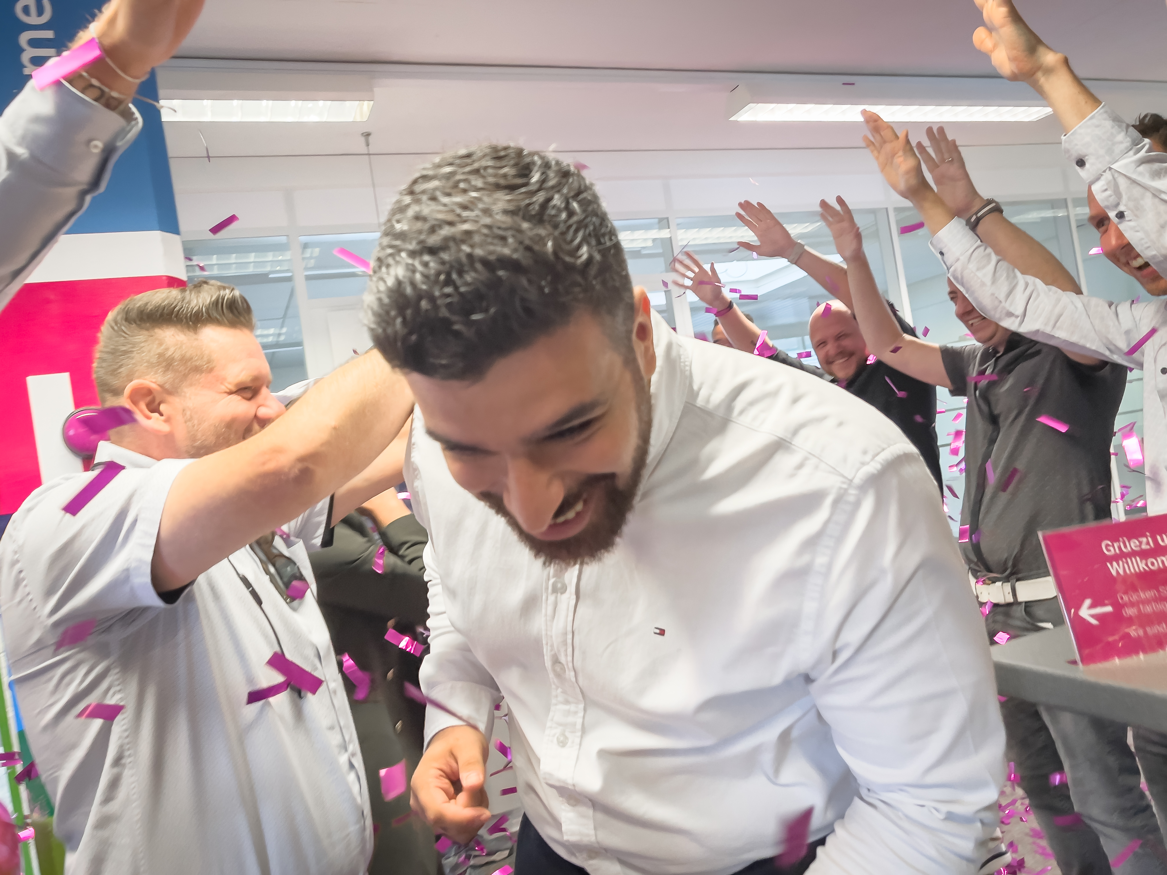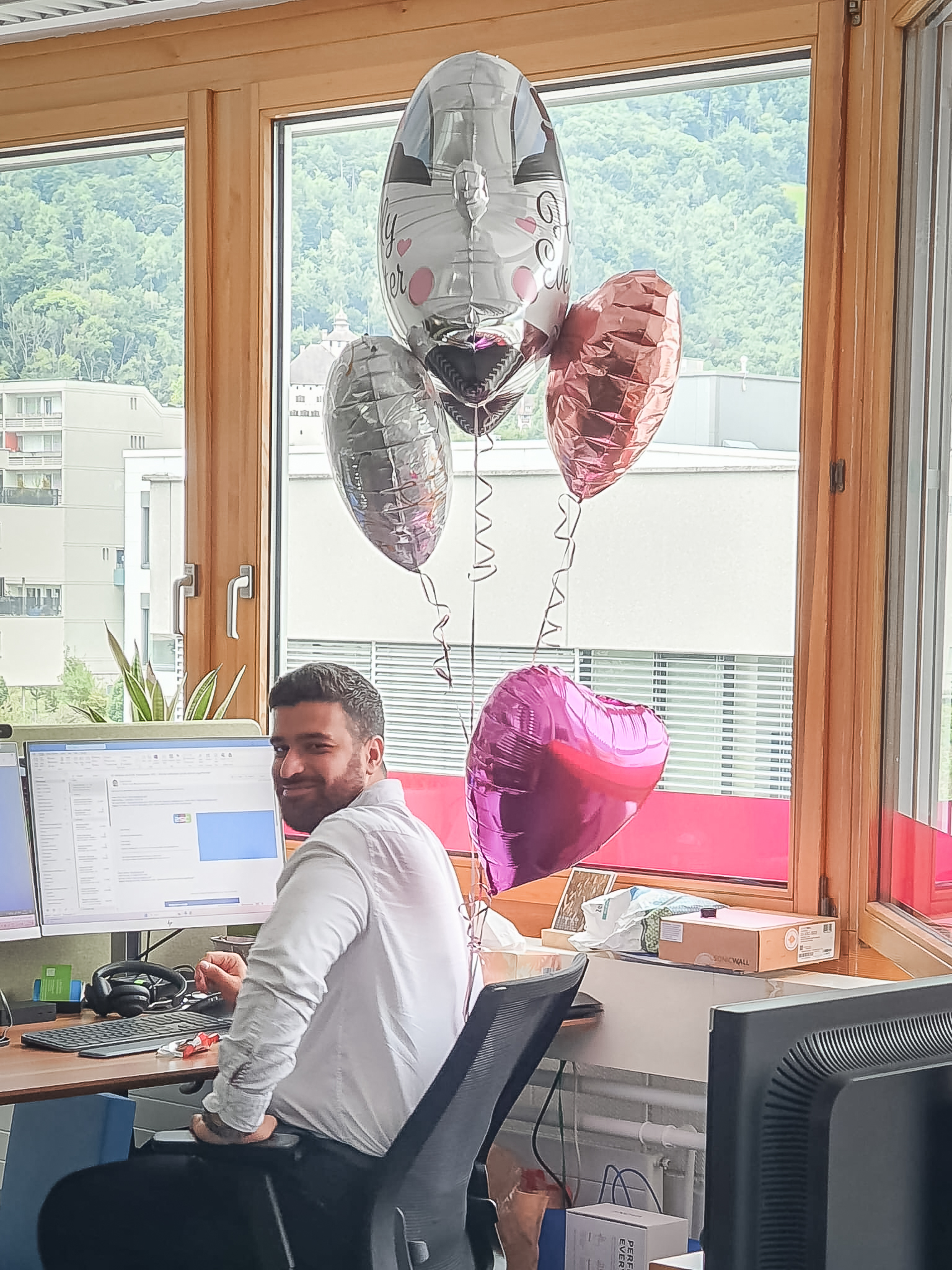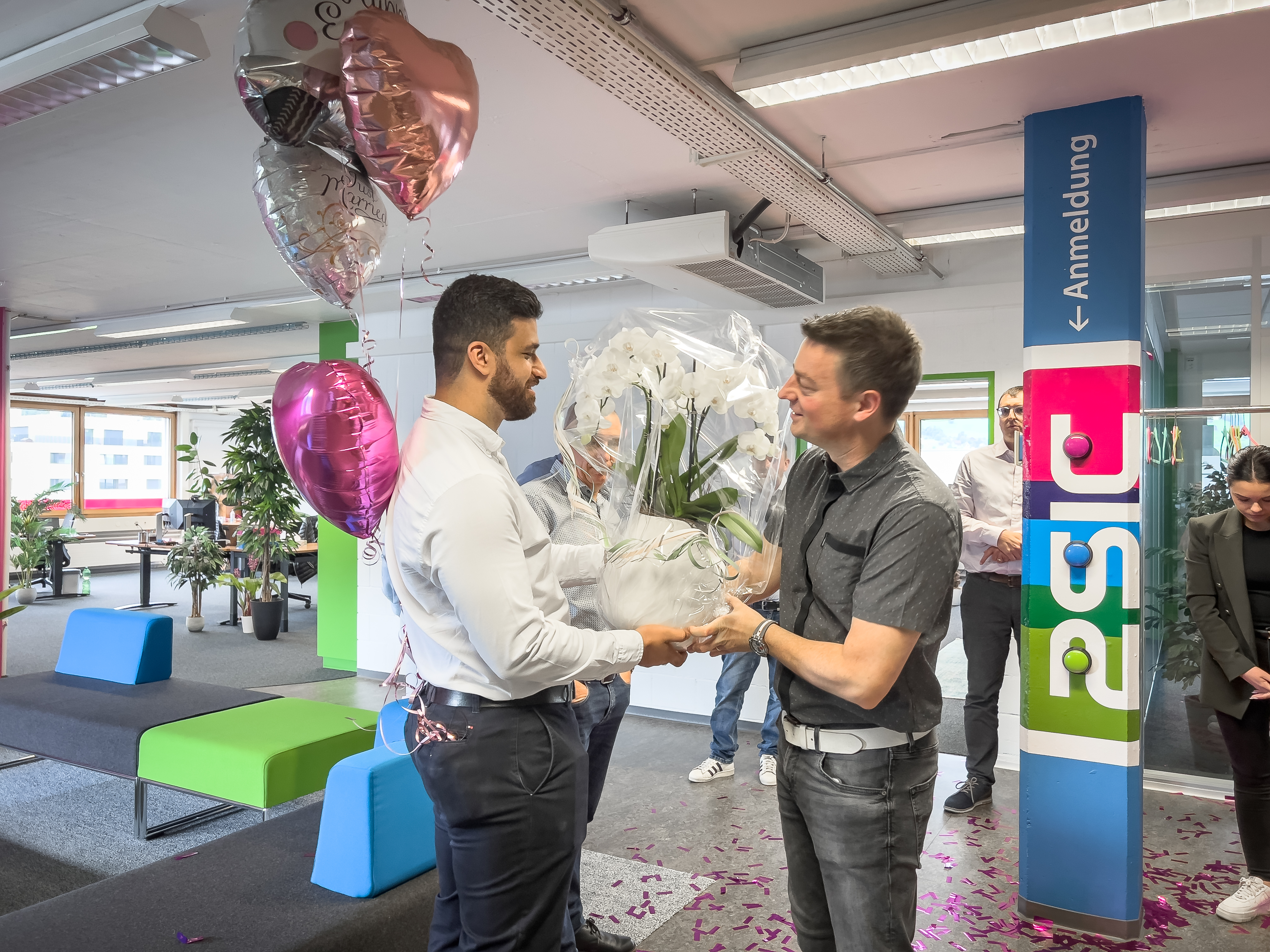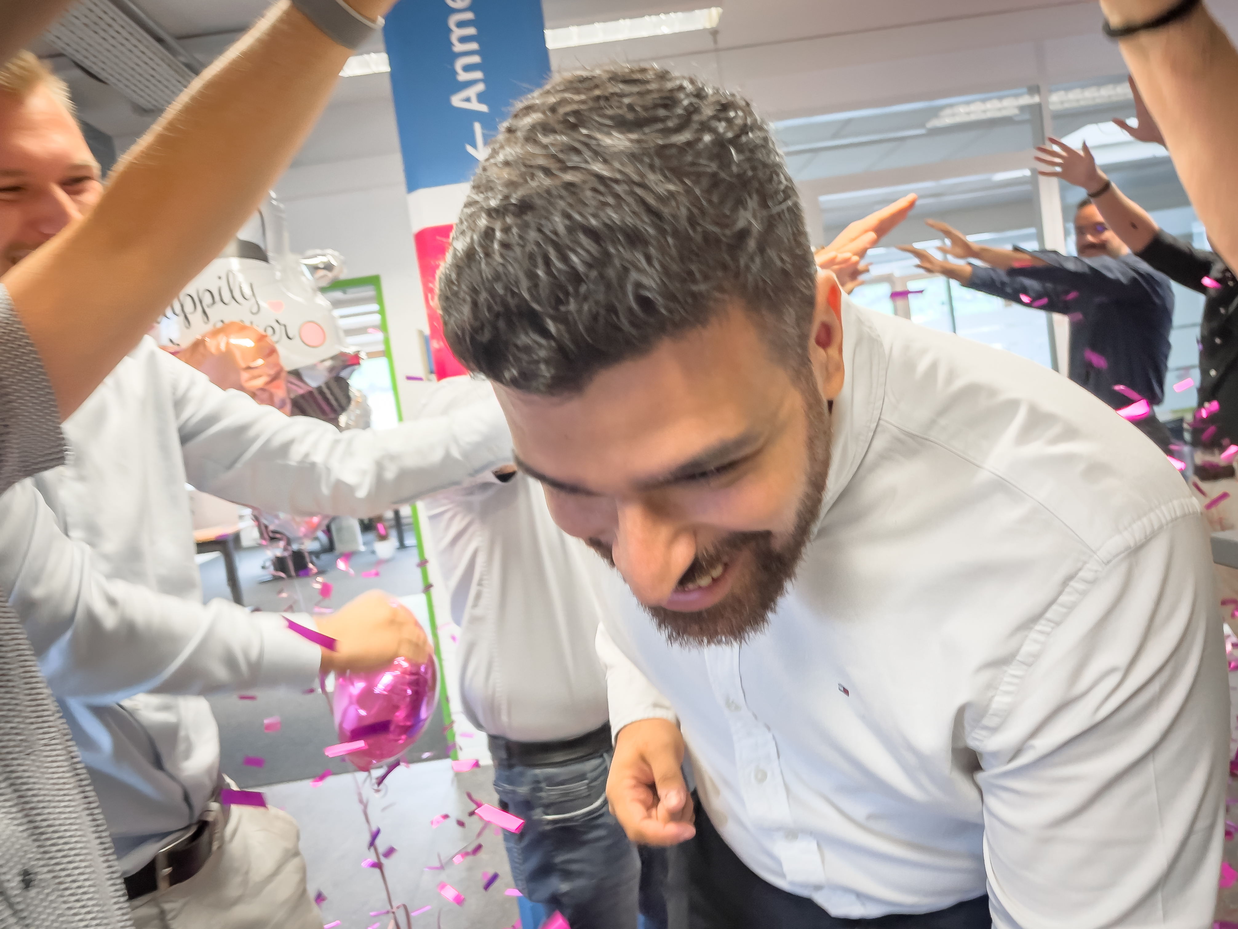 Am vergangenen Samstag hat IT-Spezialist Metin Gökcen seiner Verlobten das Ja-Wort gegeben – und heute durfte er gleich die nächste Überraschung erleben. Das 2sic-Team begrüsste ihn mit einem fröhlichen Spalier, weiss-pinken Ballonen und einer powervollen Konfettibombe.