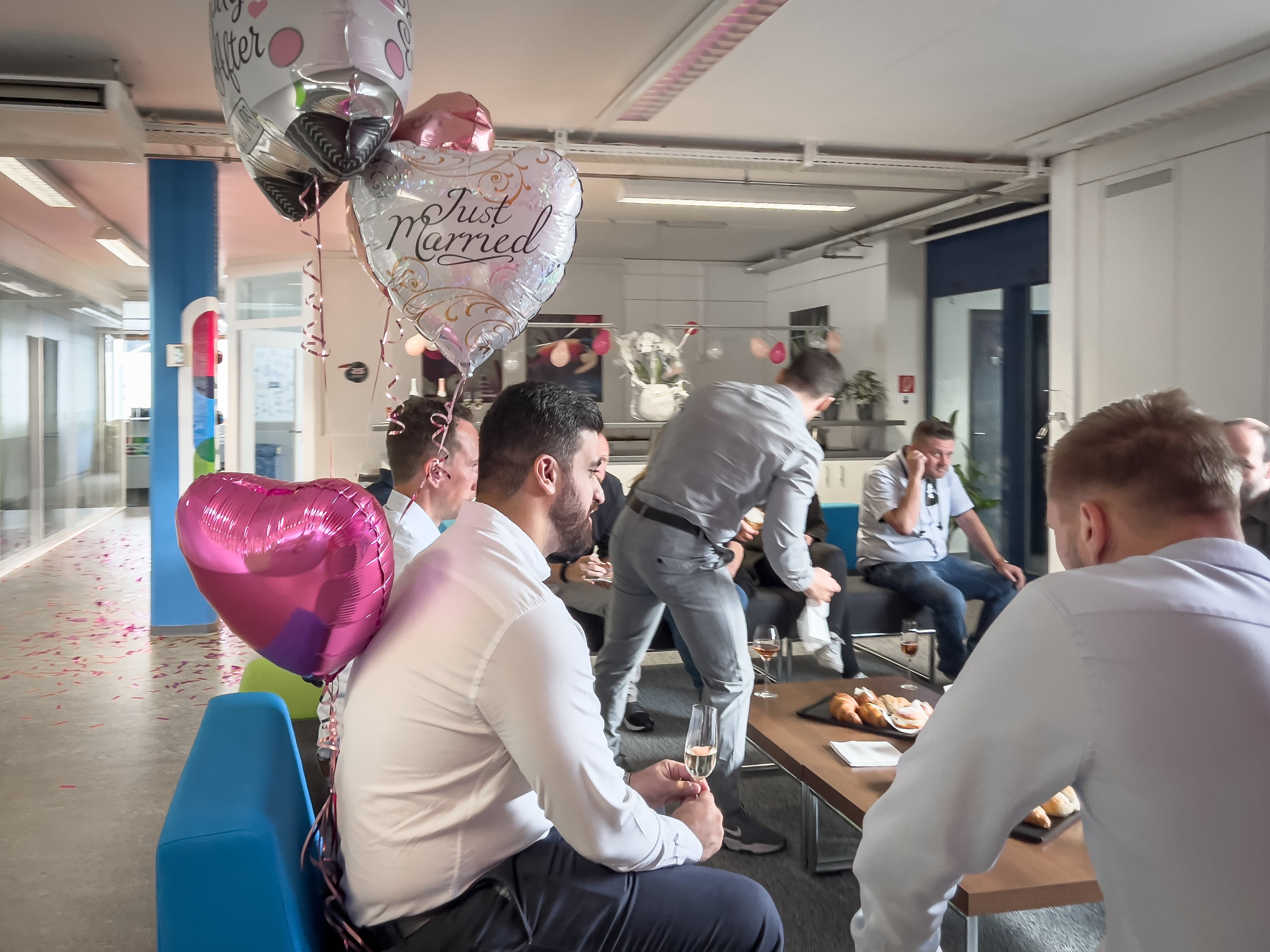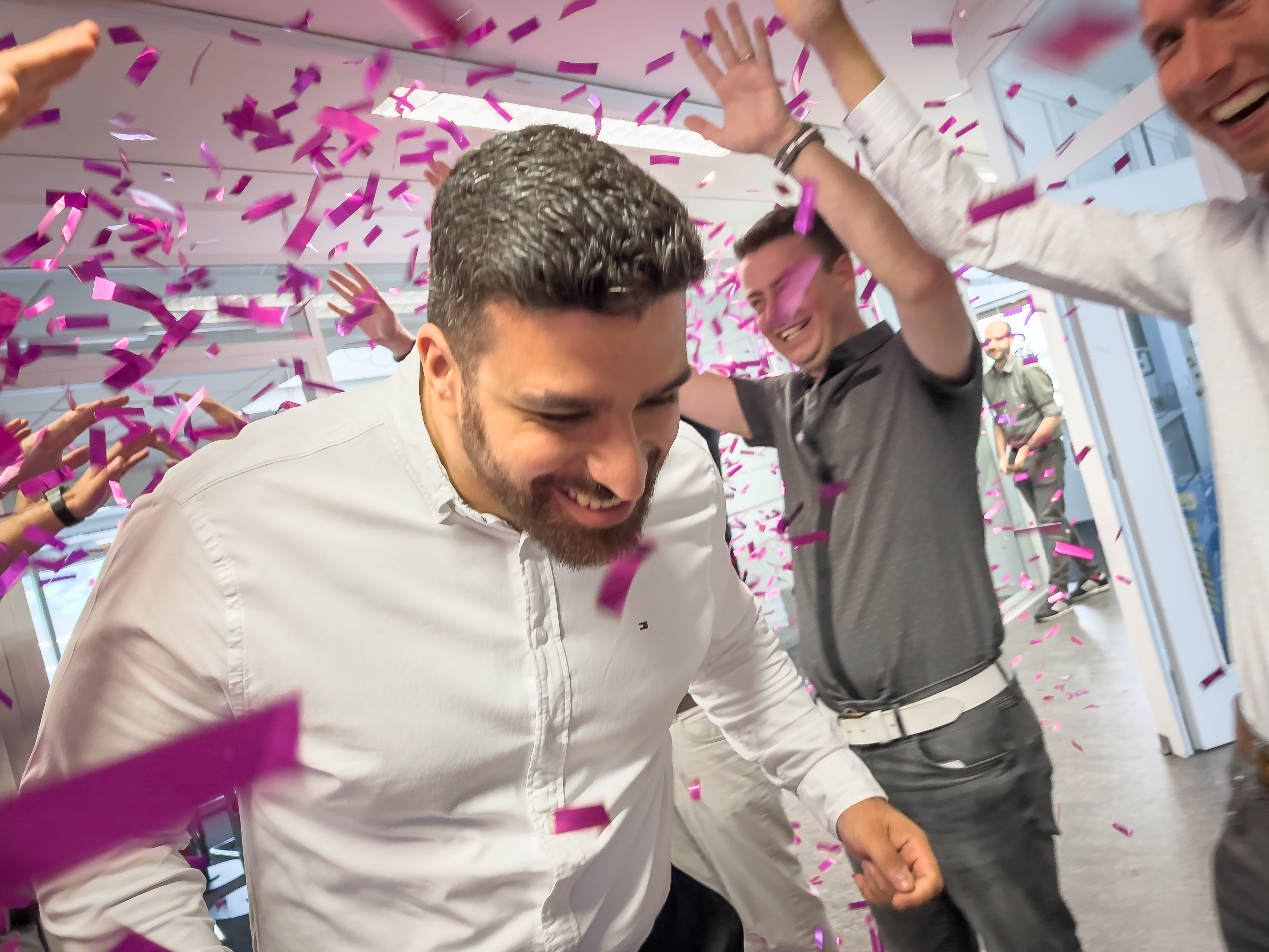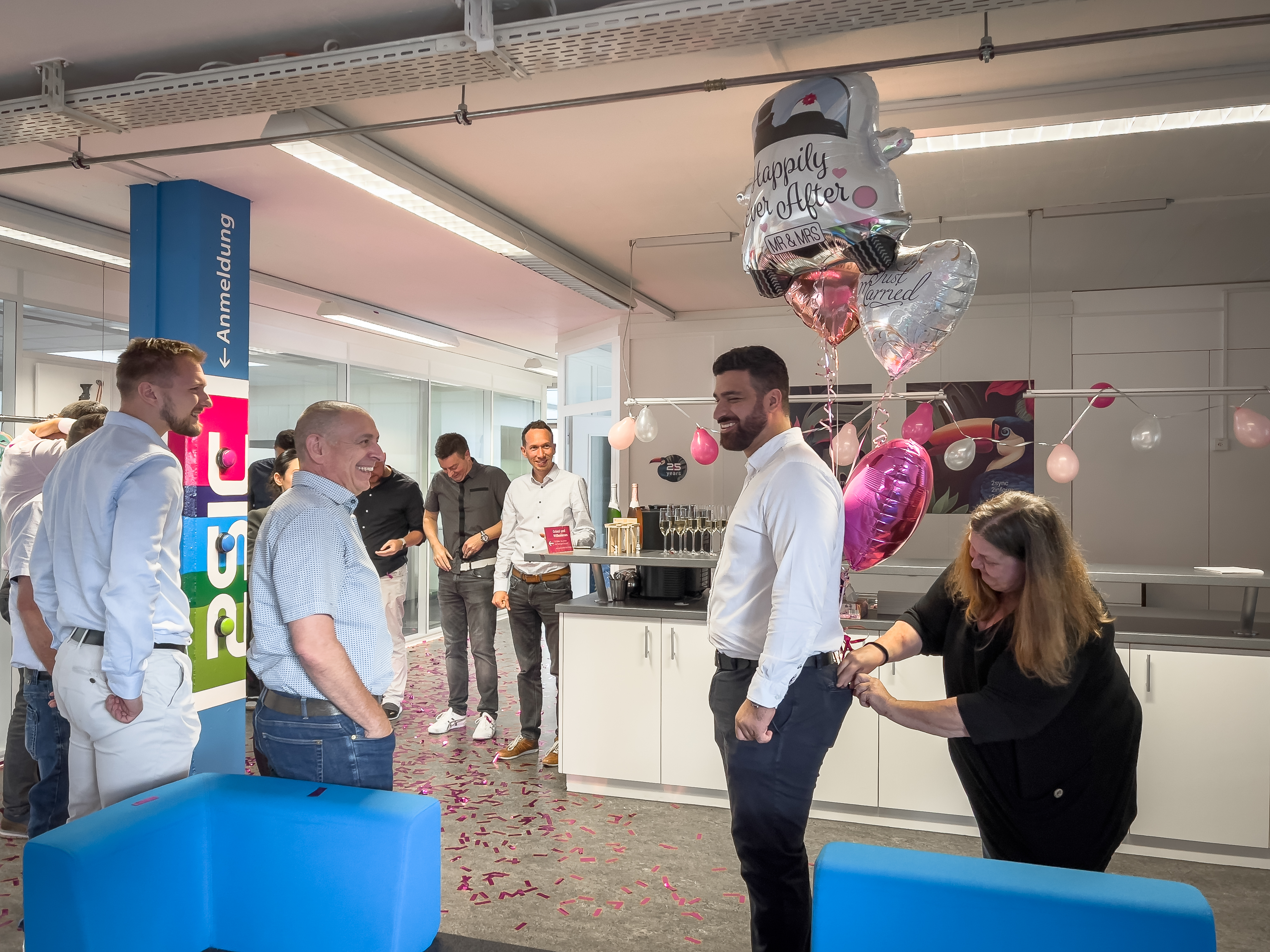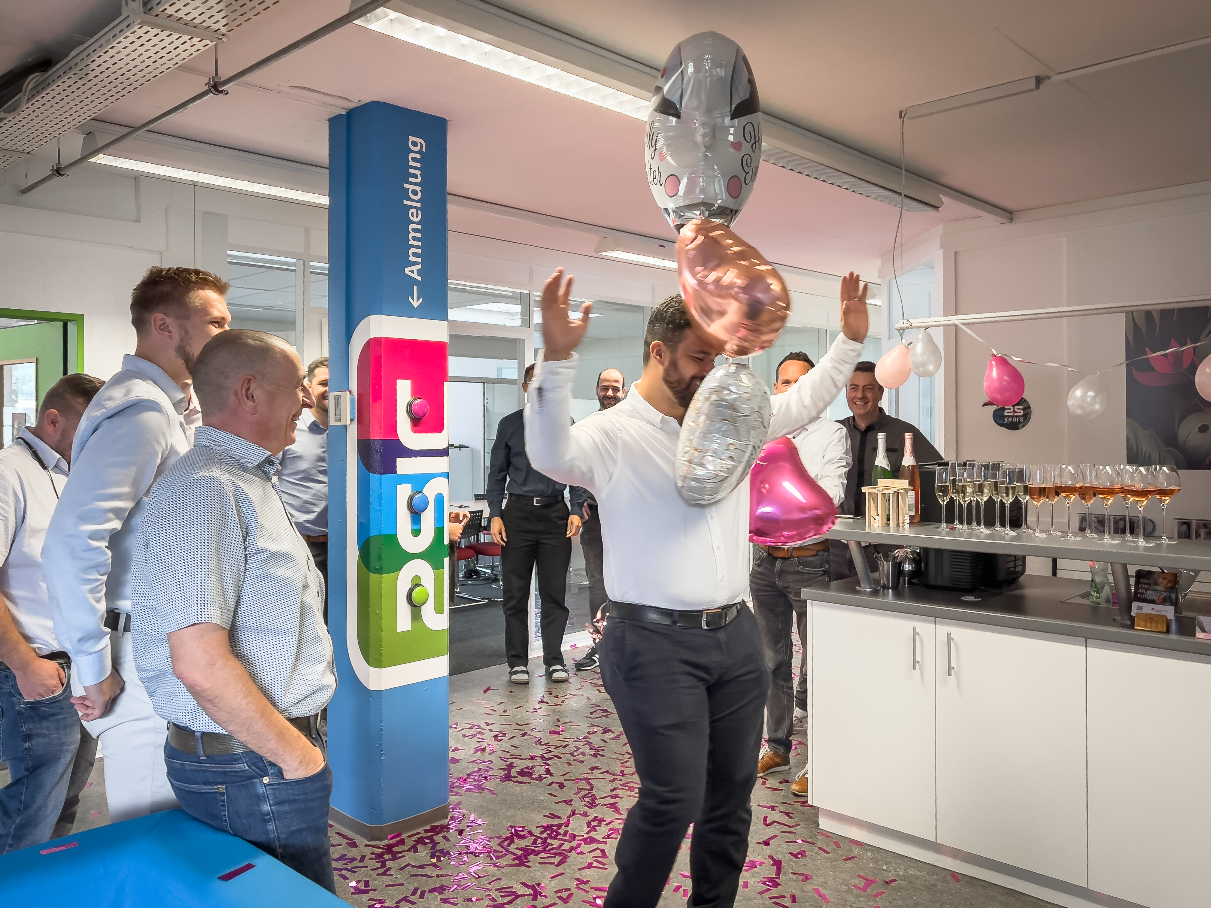 Am vergangenen Samstag hat IT-Spezialist Metin Gökcen seiner Verlobten das Ja-Wort gegeben – und heute durfte er gleich die nächste Überraschung erleben. Das 2sic-Team begrüsste ihn mit einem fröhlichen Spalier, weiss-pinken Ballonen und einer powervollen Konfettibombe.
